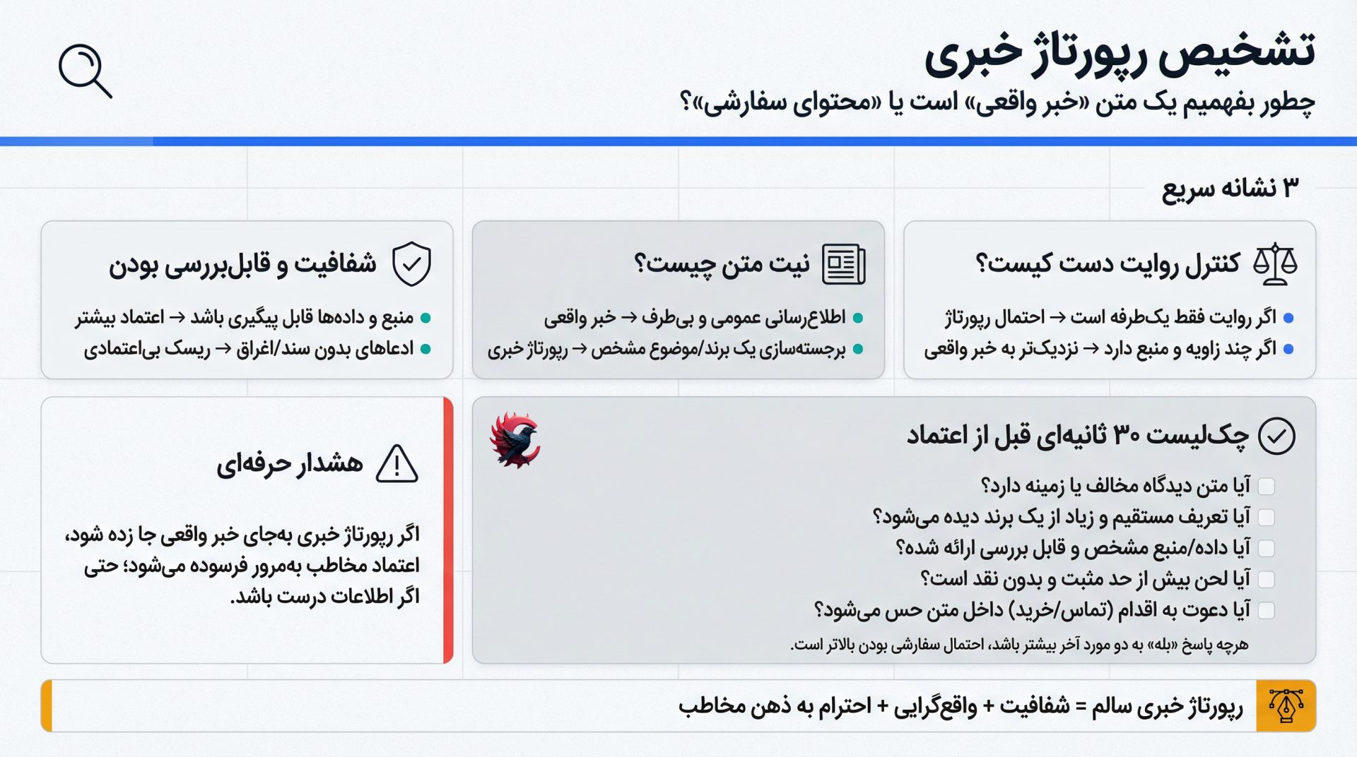 به همین دلیل است که رپورتاژ خبری اگر درست اجرا نشود، میتواند بهسرعت مرز اعتماد را مخدوش کند؛ هم برای برند، هم برای رسانه.