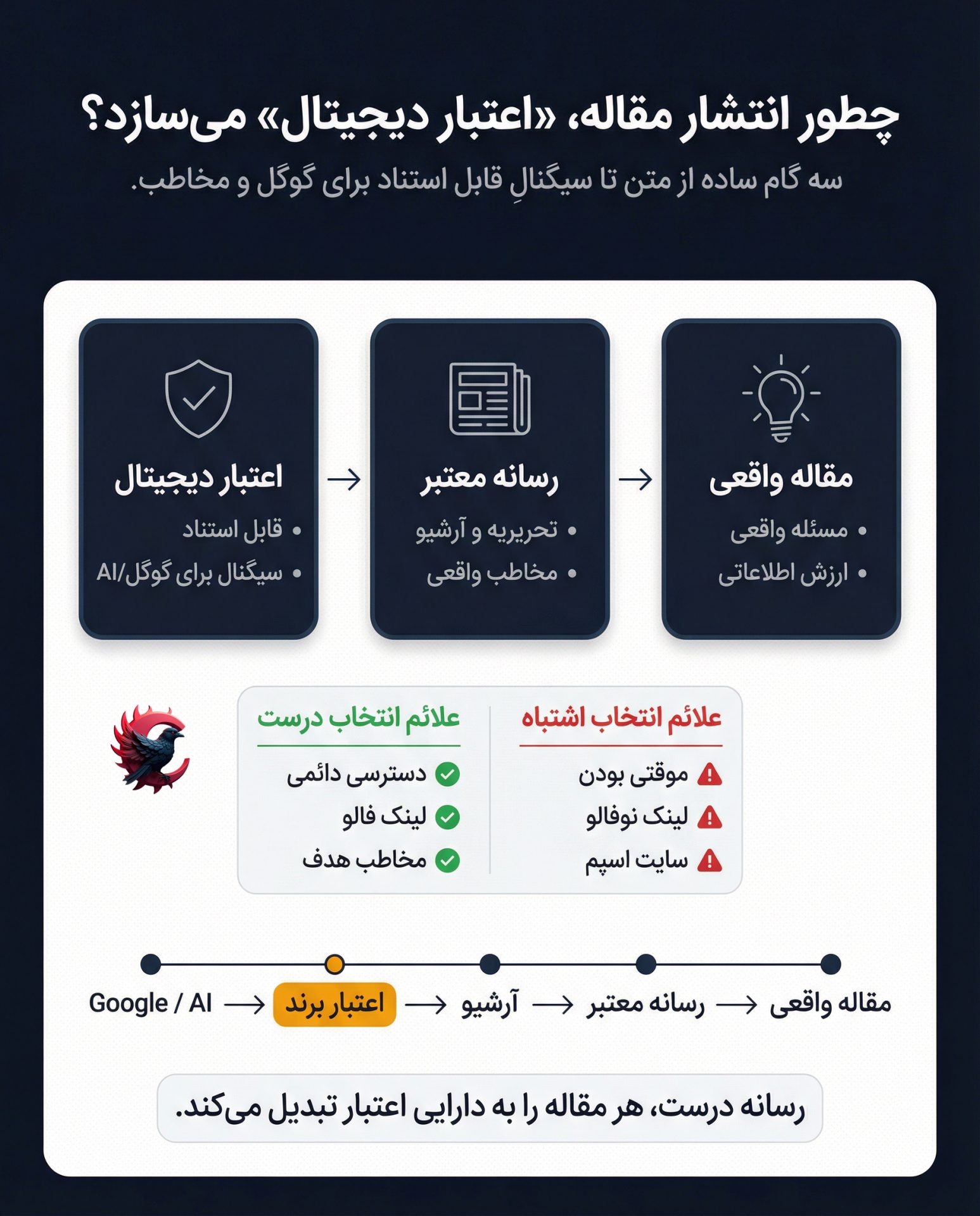 در نهایت، انتخاب اشتباه رسانه، معمولاً به این دلیل رخ میدهد که تمرکز از «اعتبار» به «قیمت» یا «سرعت انتشار» منتقل میشود. انتشار سریع و ارزان، وسوسهکننده است، اما اغلب نتیجهی معکوس دارد. مقالهای که در رسانهی نامعتبر منتشر شود، نه مرجع میشود، نه اعتماد میسازد و نه پایهی اعتبار دیجیتال را تقویت میکند.