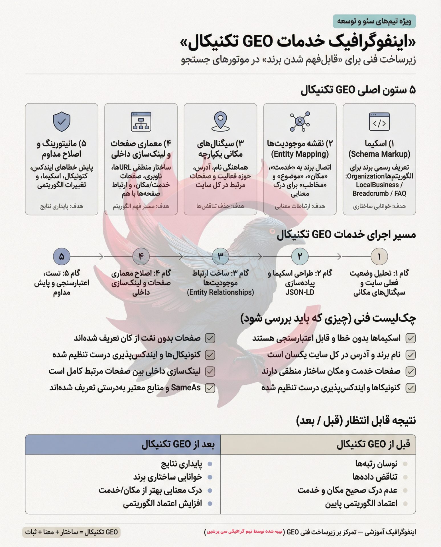 وقتی وارد لایهی عمیق خدمات GEO تکنیکال میشویم، دیگر بحث سلیقه یا تجربه شخصی مطرح نیست؛ اینجا همهچیز به زبان داده، ساختار و منطق الگوریتمها تعریف میشود. اگر GEO را یک سیستم در نظر بگیریم، اجزای فنی آن همان قطعاتی هستند که این سیستم را قابل اجرا و قابل اعتماد میکنند.