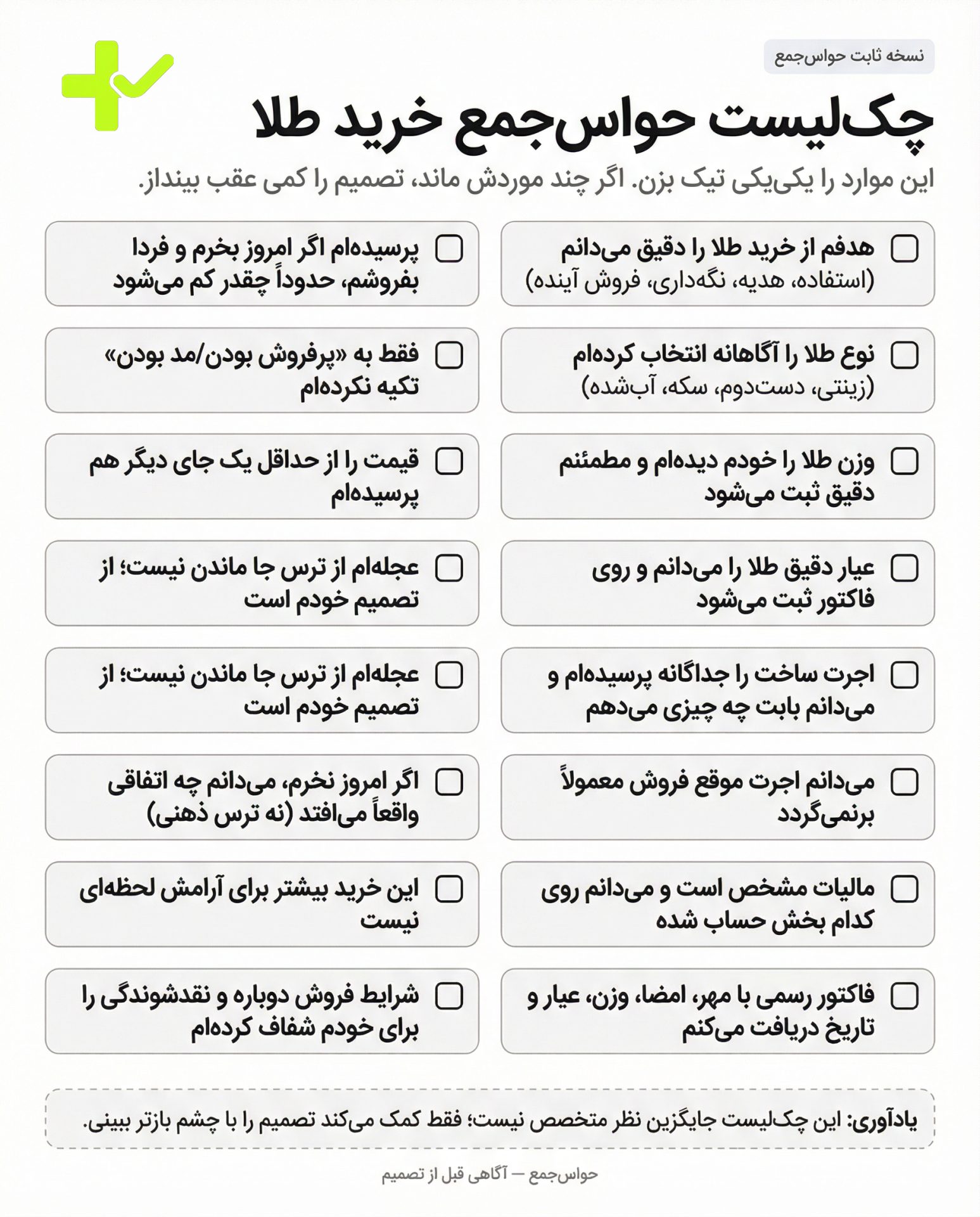 ⬜ دقیق می‌دانم هدفم از خرید طلا چیست (استفاده، هدیه، نگه‌داری، فروش آینده)