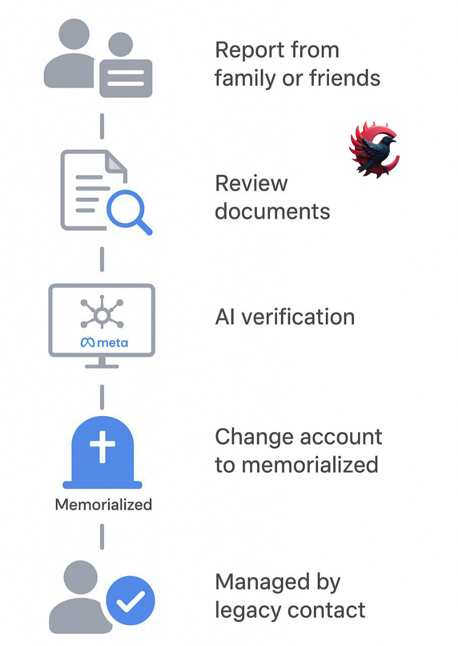در سیاستهای جدید متا، اگر کاربر پیش از مرگ خود فردی را به عنوان Legacy Contact تعیین کرده باشد، اولویت با آن شخص است. اما اگر چنین فردی تعیین نشده باشد، اولویت با وراث قانونی است که مدارک رسمی را ارائه دهند.